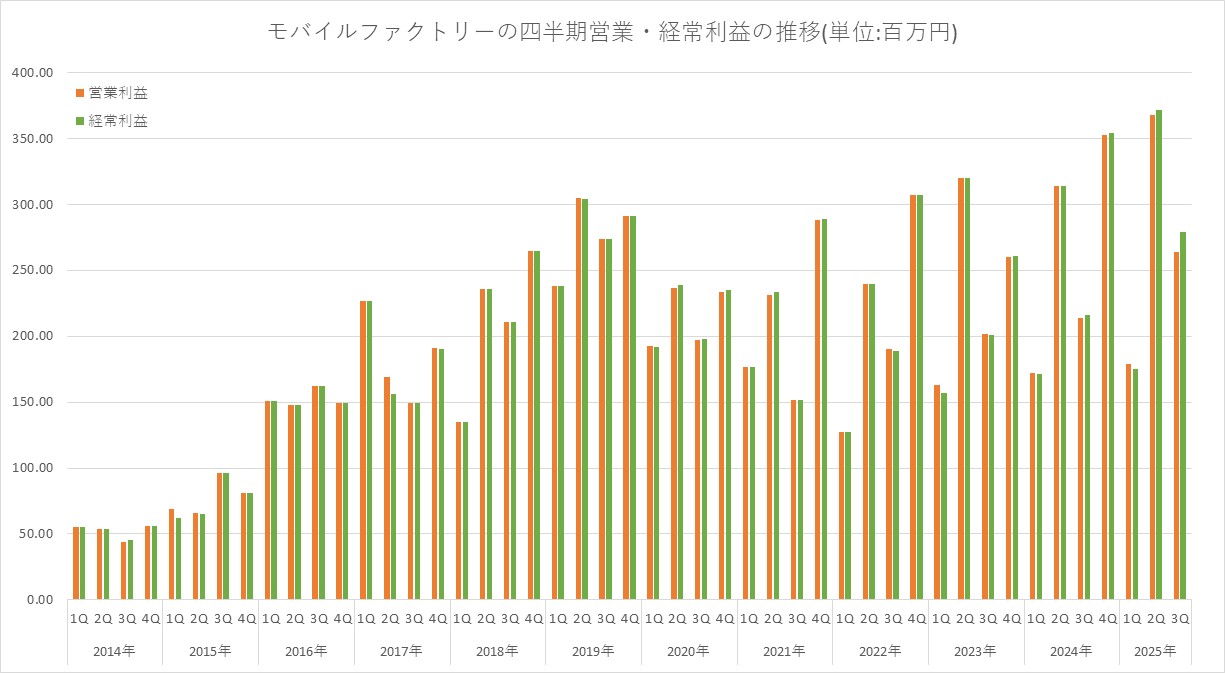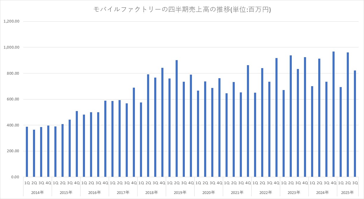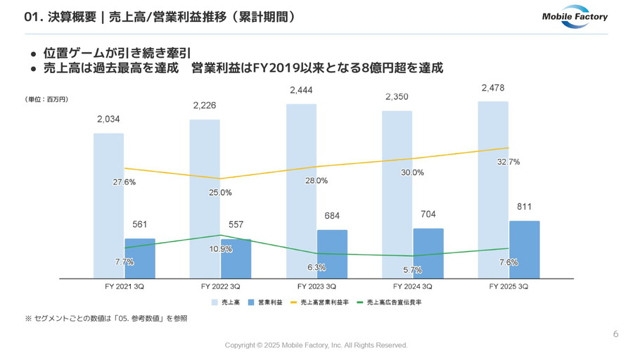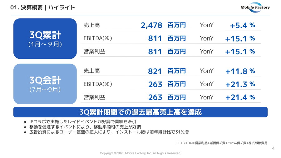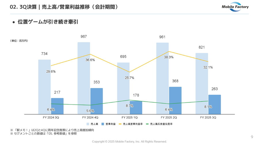 モバイルファクトリー<3912>は、2025年12月期第3四半期(3Q)決算説明資料を公開した。位置情報ゲーム「駅メモ!」シリーズの好調を背景に、売上・利益ともに堅調に推移し、売上高は過去最高、営業利益は2019年12月期以来の8億円超えを達成した。