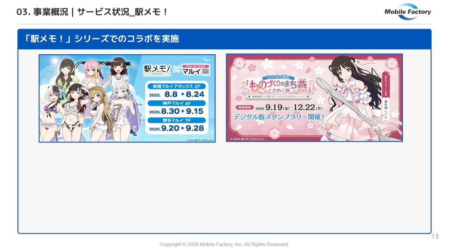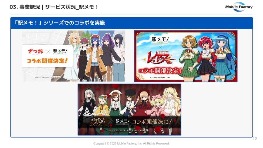 「駅メモ!」シリーズの取り組みについても紹介しており、「ざっ旅」「マジックナイト レイアース」「ローゼンメイデン」といった人気IPとのコラボを実施し、ファン層の拡大を図った。