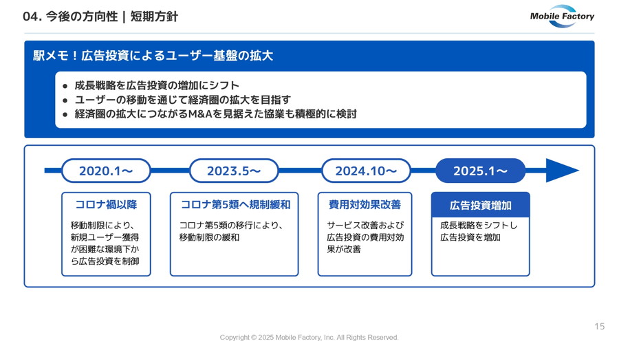 短期方針として、成長戦略の軸を広告投資拡大にシフト。「駅メモ!」を中心とした広告投資により、ユーザー基盤のさらなる拡大を目指す。コロナ禍では広告投資を抑制していたが、202年5月のコロナ第5類移行および2024年10月からの費用対効果改善を受け、2025年1月以降は投資を再拡大している。