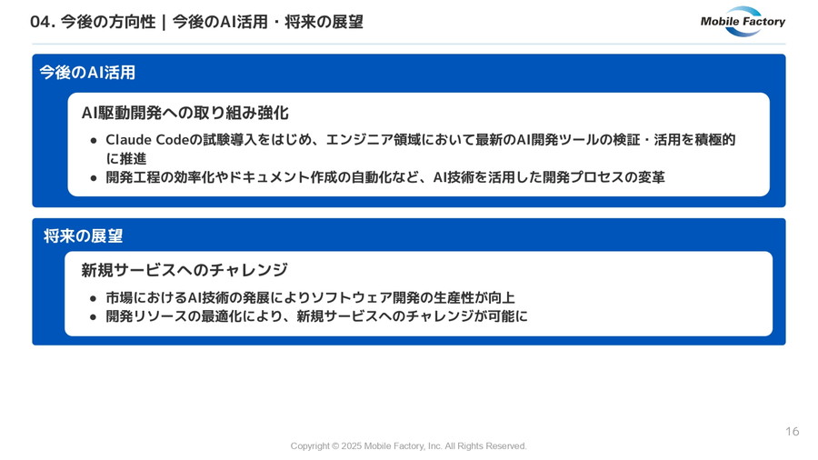 また、AI技術の活用にも注力しており、Claude Codeの試験導入をはじめとするAI開発ツールの検証を進めている。開発工程の効率化やドキュメント作成の自動化などを通じ、AI駆動型の開発体制を構築中だ。