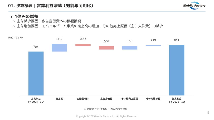 営業利益の増減は、1億円の増益だったが、増減要因についても分析している。モバイルゲーム事業の売上増加や人件費などの原価抑制が寄与した一方、積極的な広告宣伝費を投入したとのことだった。