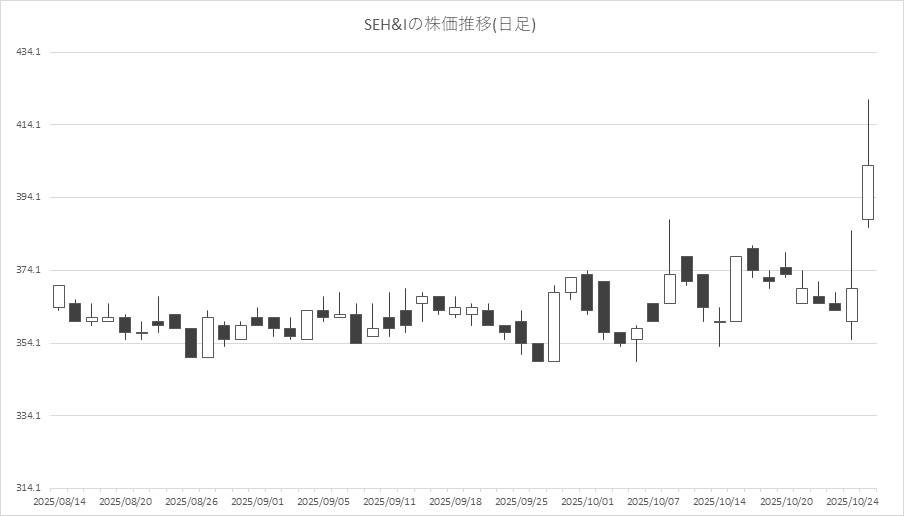 10月27日の東京株式市場では、SEホールディングス・アンド・インキュベーションズ(SEH&I)<9478>が大幅続伸し、年初来高値を更新した。先週末10月24日、発行済株式総数の2.83%に当たる45万株、1億5000万円を上限とした自社株買いを実施することを発表したことが手がかり材料視されている。