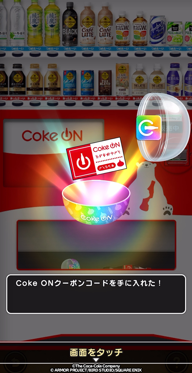 フィールドに出現するコラボレーションモンスターを倒すと、「Coke ONコラボメダルIV」が手に入る。そしてゲーム内のフィールドには、全国のCoke ON対応自販機が「Coke ONコラボスポット」として出現!「Coke ONコラボスポット」では、集めた「Coke ONコラボメダルIV」を使って「Coke ONくじ」を引くことができる。「Coke ONくじ」を引いて限定アイテムや無料ドリンクチケットなどの報酬を手に入れよう!