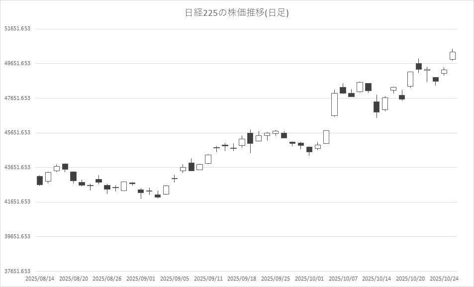 10月27日前場の東京株式市場は続伸。日経平均株価は、前営業日比1037円71銭高の5万0337円36銭で午前中の取引を終えた。史上最高値を更新し、初の5万円の大台に乗せた。高市早苗内閣の支持率の高さに加えて、米中貿易摩擦への過度な警戒感が後退したことを背景に、一時1191円高の5万0491円23銭まで買われた。