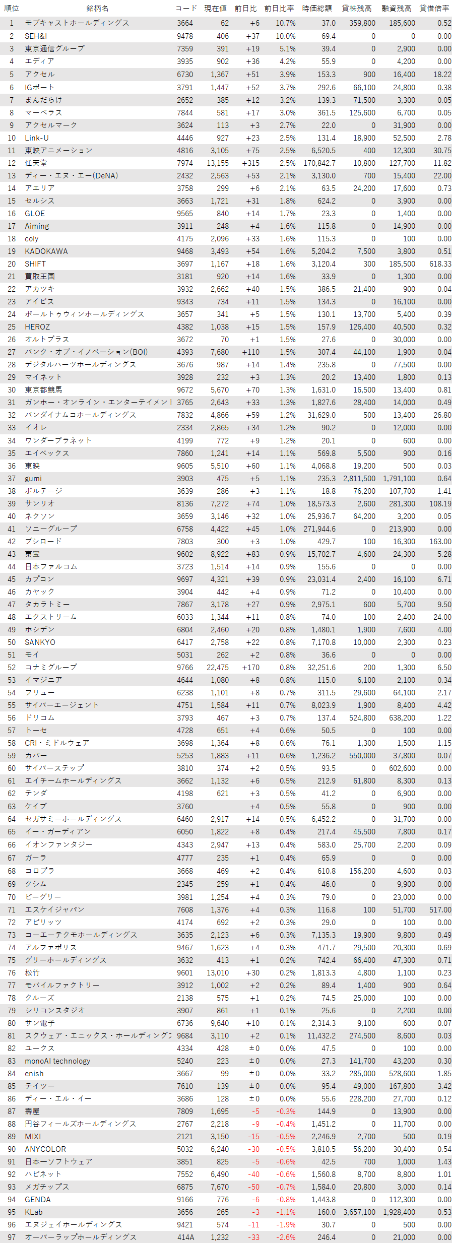 最後に騰落ランキングを見ると、モブキャストHD<3664>やSEH&I<9478>、東京通信G<7359>、エディア<3935>が値上がり率上位となり、オーバーラップHD<414A>、KLab<3656>、GENDA<9166>、メガチップス<6875>が値下がり率上位となった。