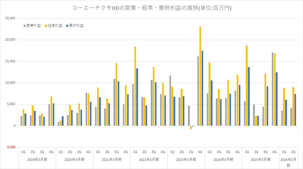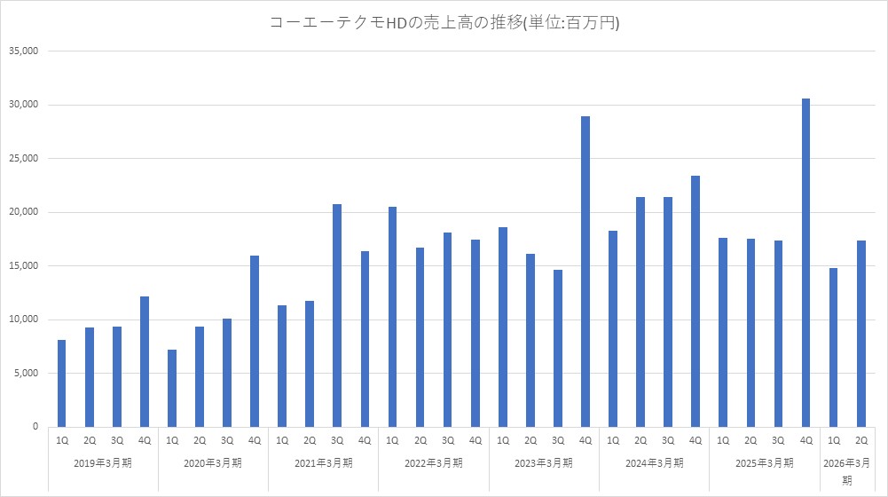 コーエーテクモホールディングス<3635>は、10月27日、2026年3月期 第2四半期累計の連結決算を発表し、売上高312億6800万円(前年同期比11.2%減)、営業利益79億6400万円(同25.2%減)、経常利益177億9500万円(同15.3%減)、最終利益134億6500万円(同15.7%減)だった。