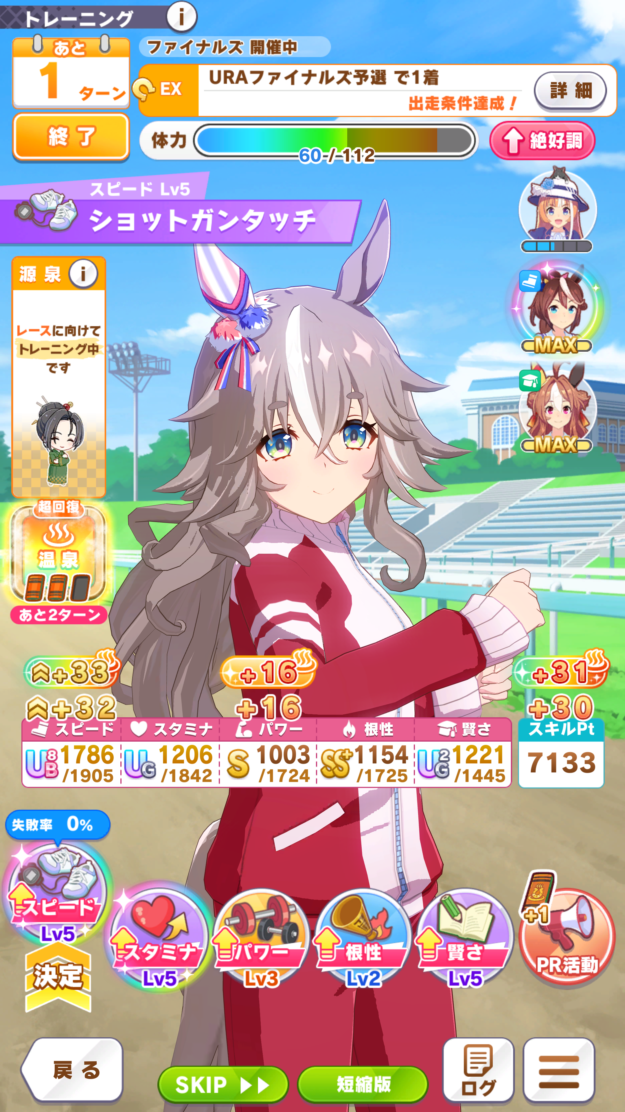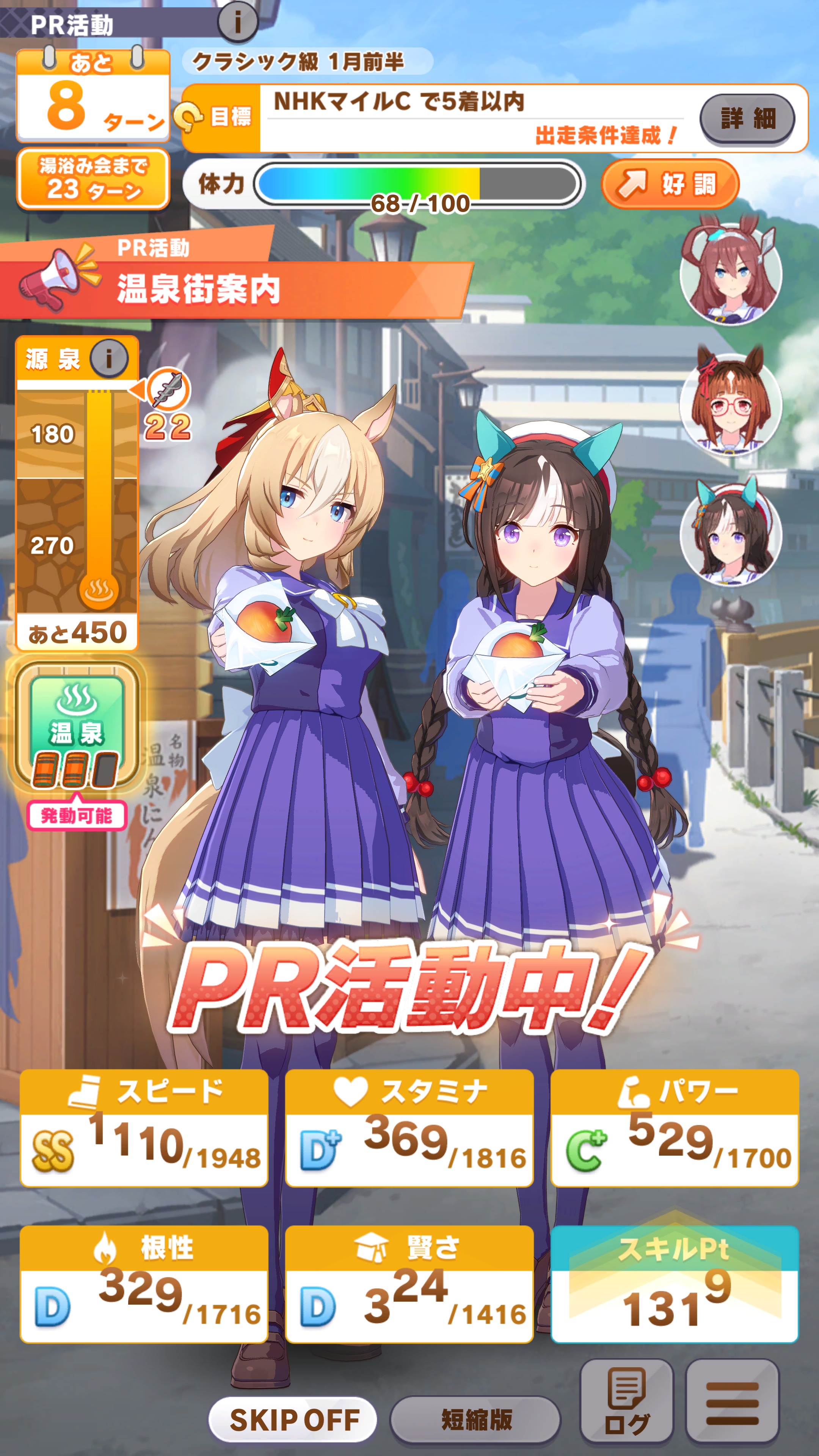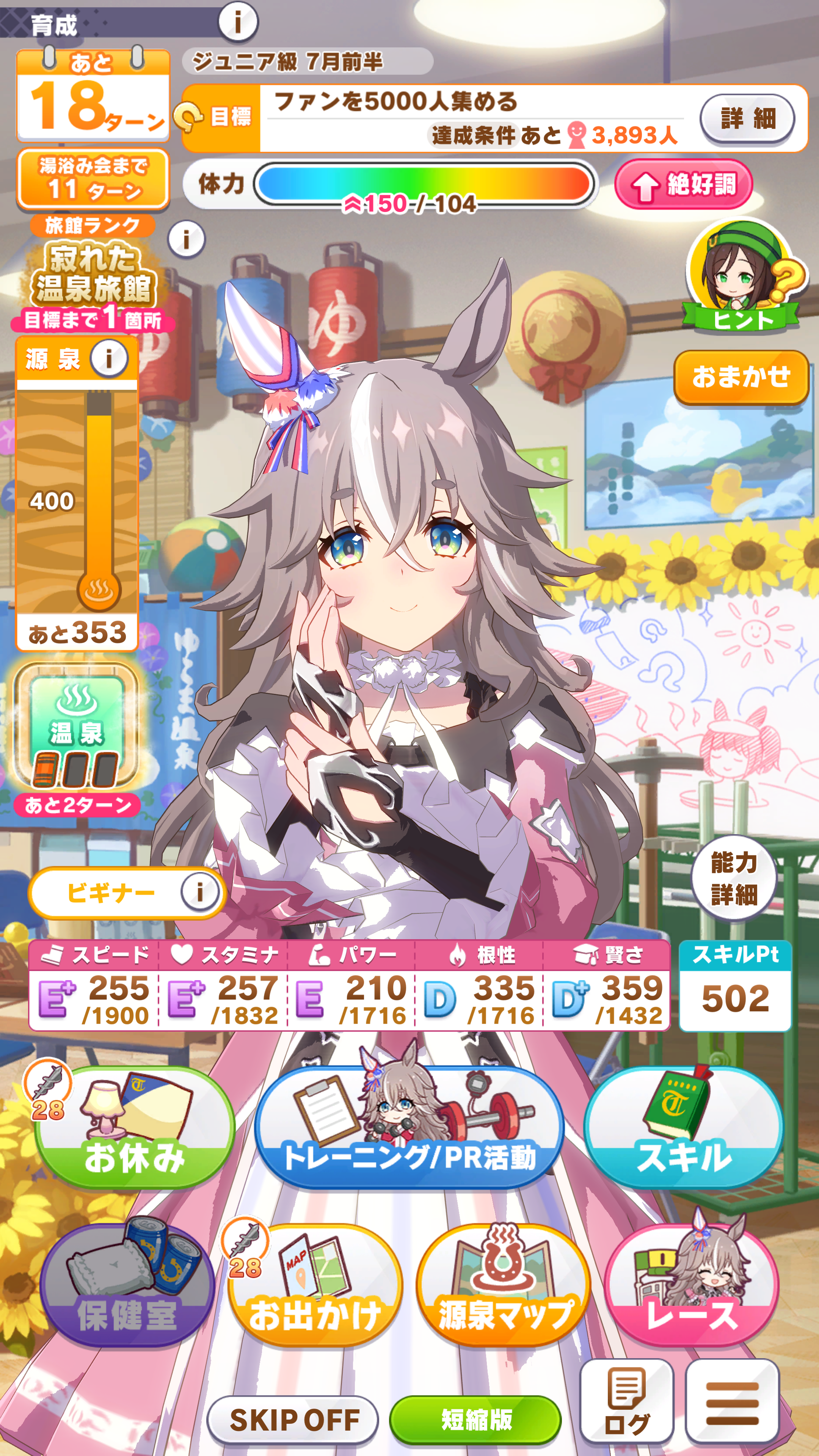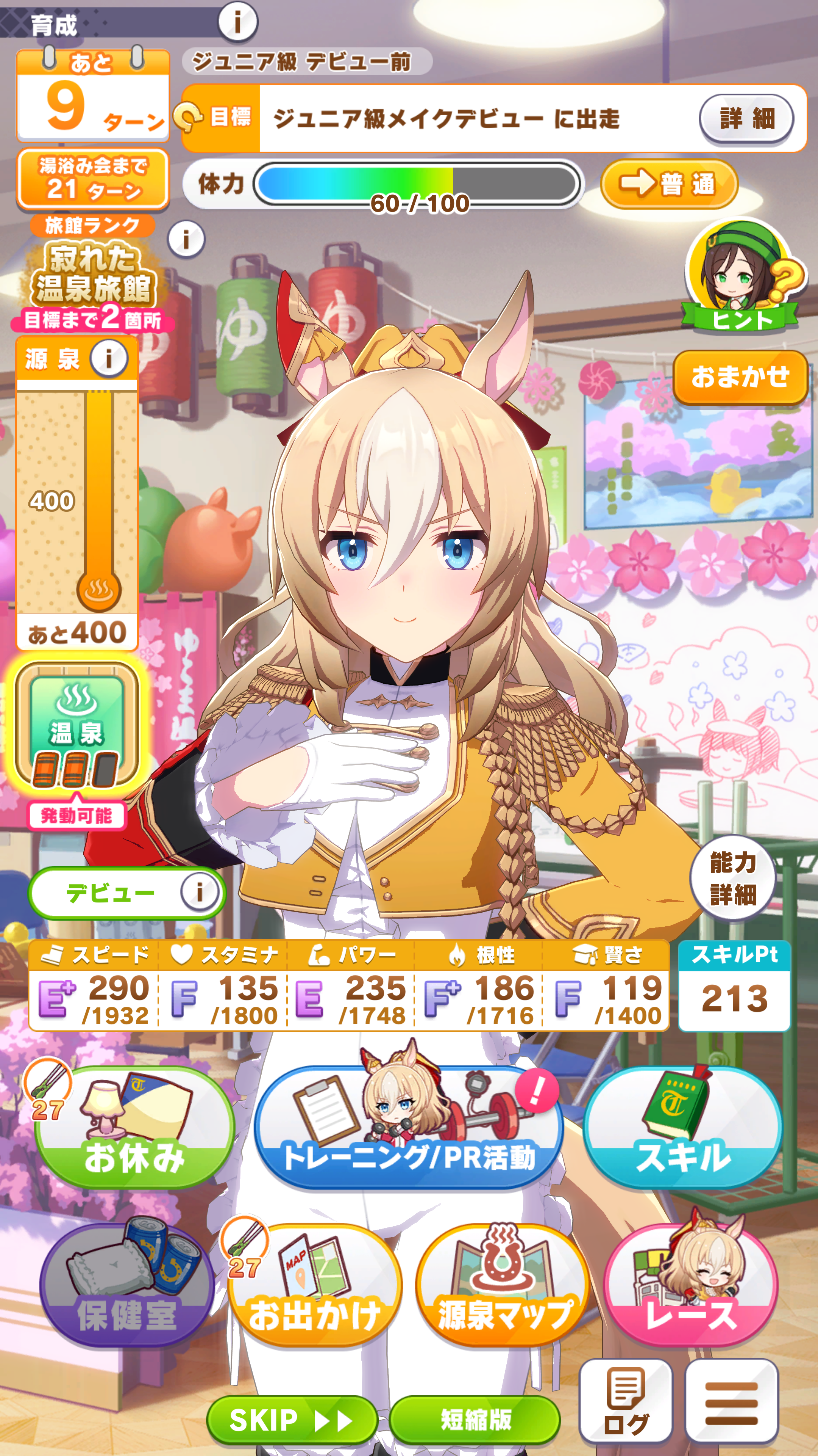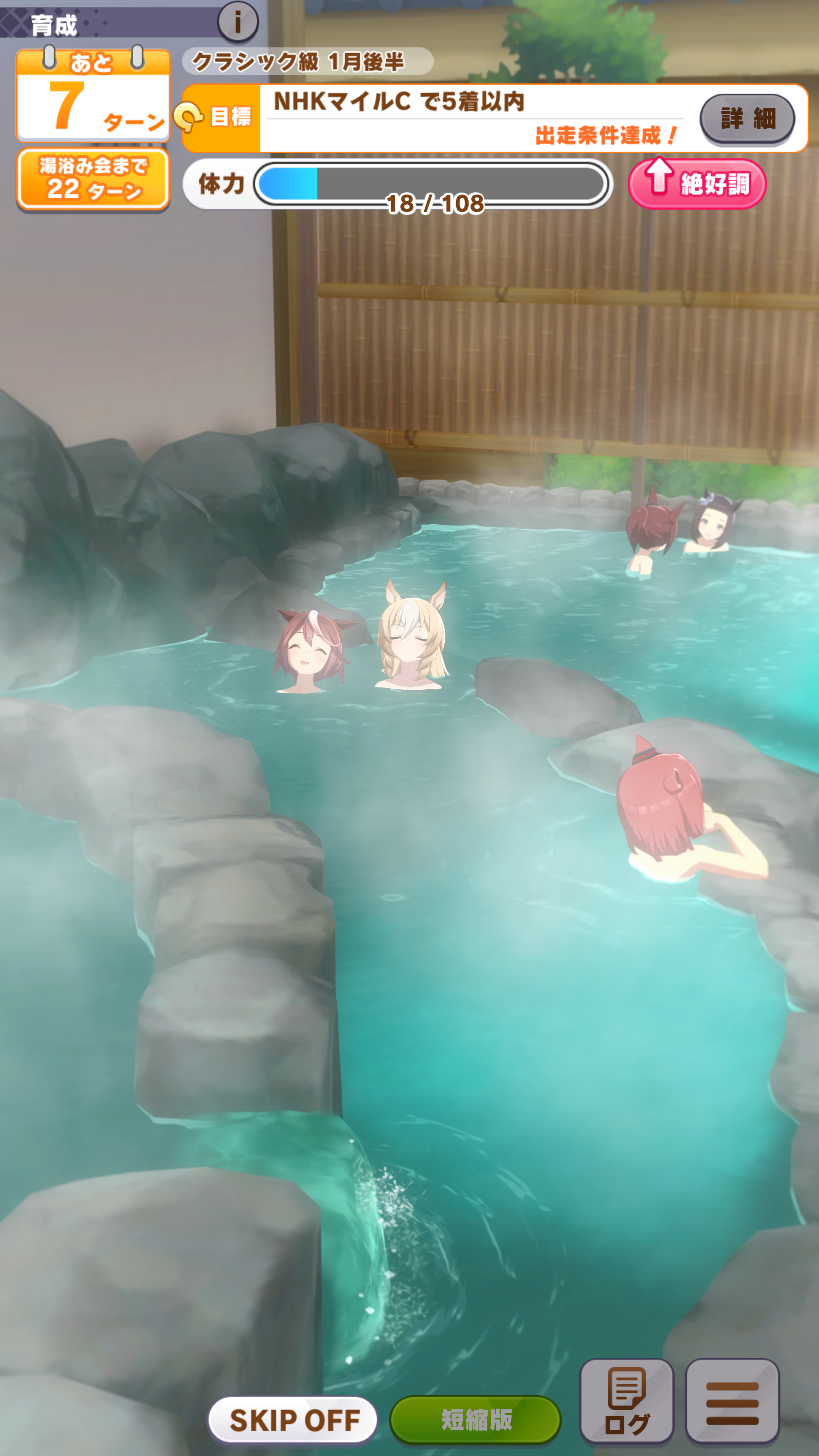 そうこうしながら育成シナリオを進めると、毎年年末に「湯浴み会」が開催。掘削完了した源泉数に応じて、ふつう、いい湯、シニア級の湯浴み会ではその上の最高評価が得られ、その評価に応じて全パラメータとスキルPt、シニア時にはシナリオスキル固有ヒントも獲得できる仕組みとなっている。