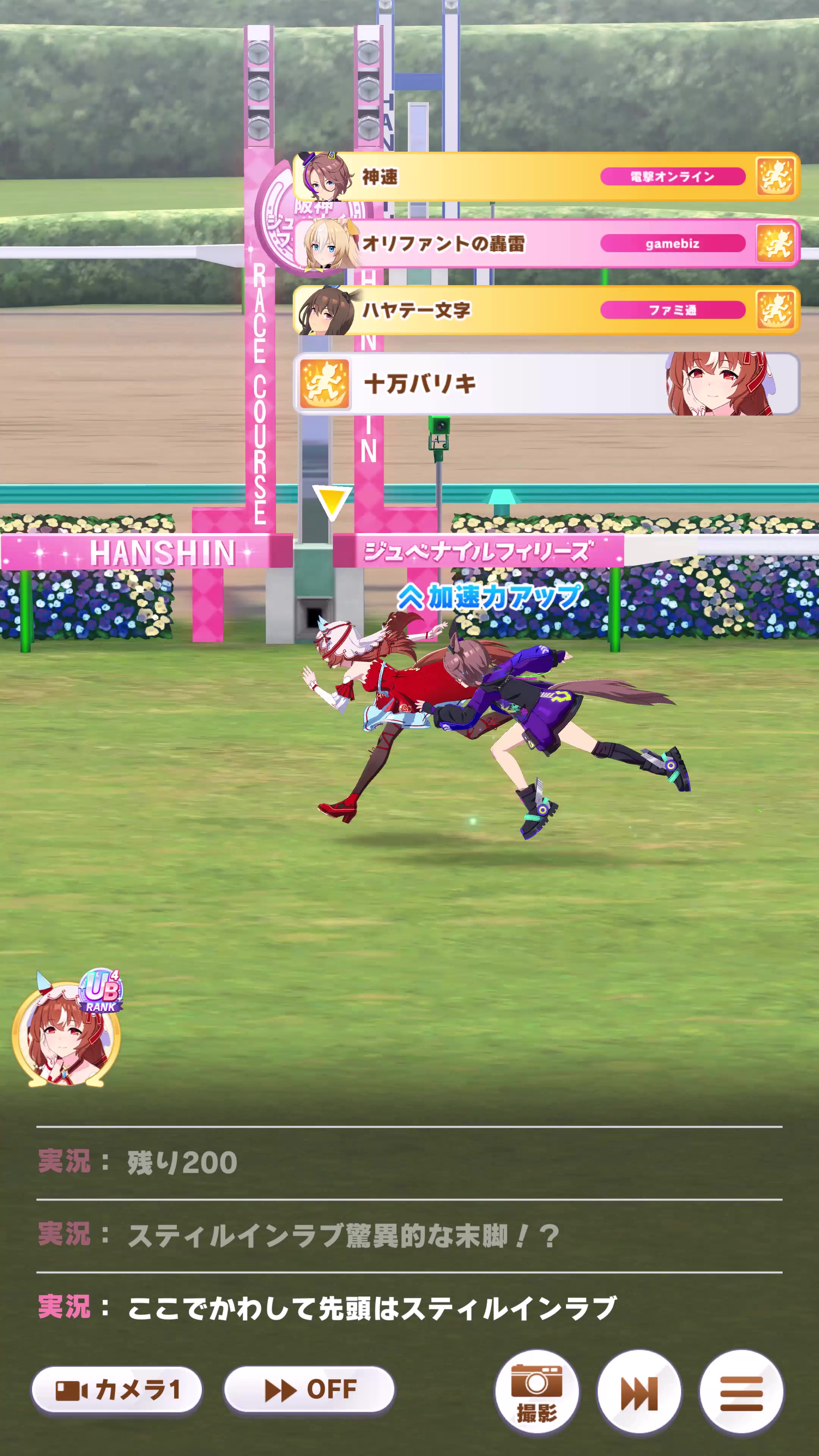 今回のレースの舞台は「阪神ジュベナイルフィリーズ(阪神 芝 1600m)」。gamebizはもちろん、自慢の騎士・デュランダルで参戦。強めのスキルをうまく獲得できたこともあり、なんと1番人気になった。