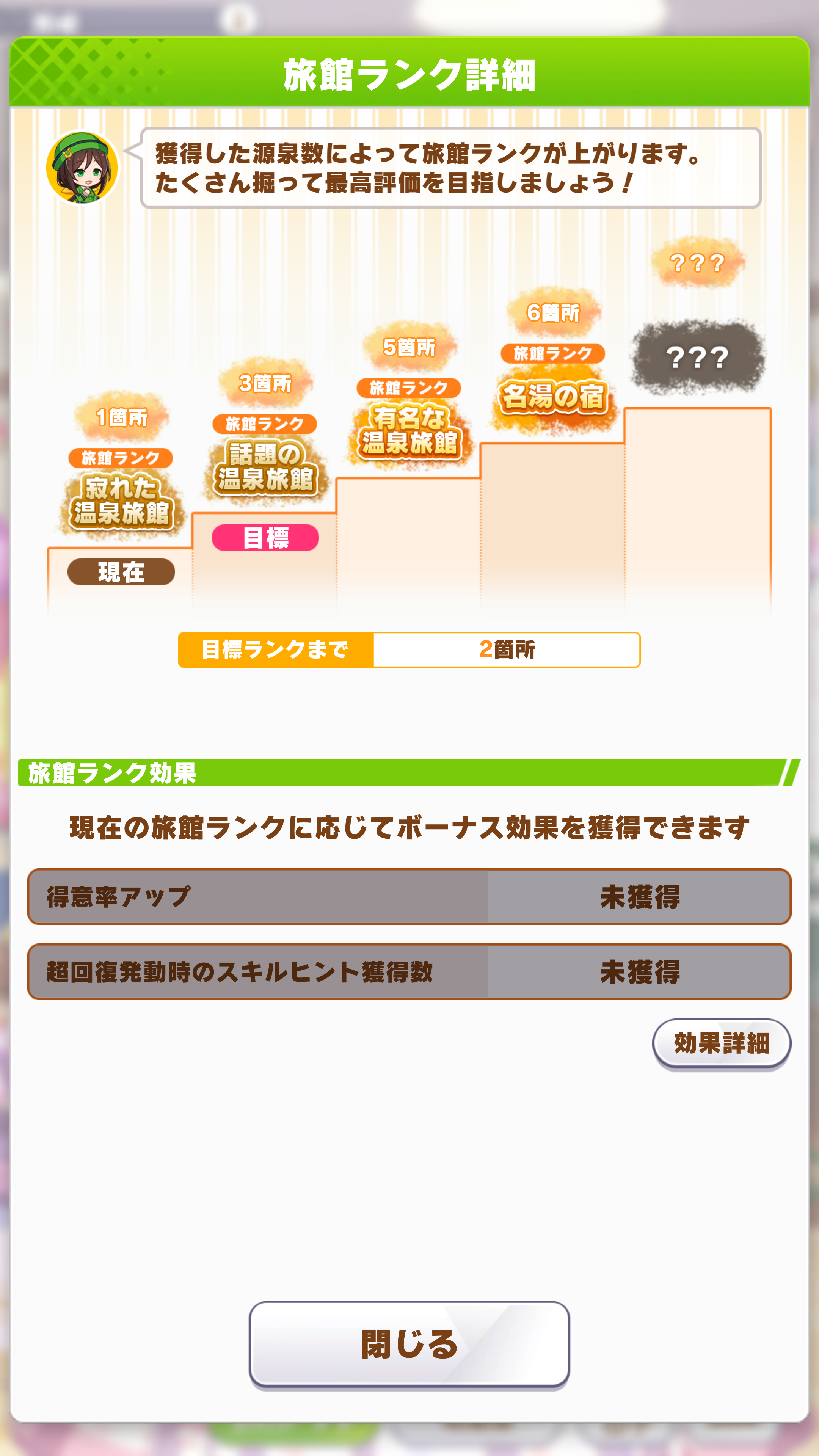 また、掘削完了した源泉数に応じて「旅館ランク」も上がっていく。ランク効果として、得意率アップや超回復(※後述)時のスキルヒント獲得数などのボーナス効果を得られるので、とにかく効率よく掘削していくことが重要だ。