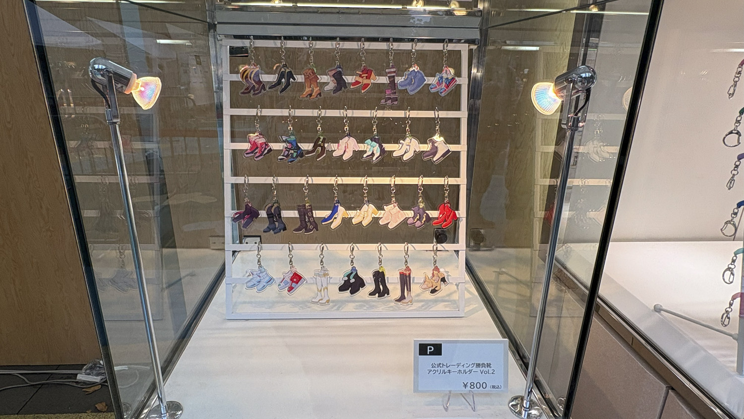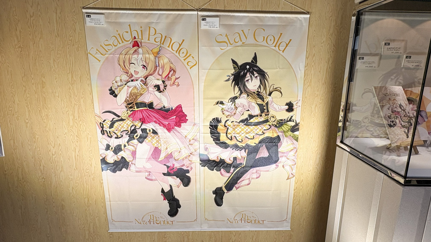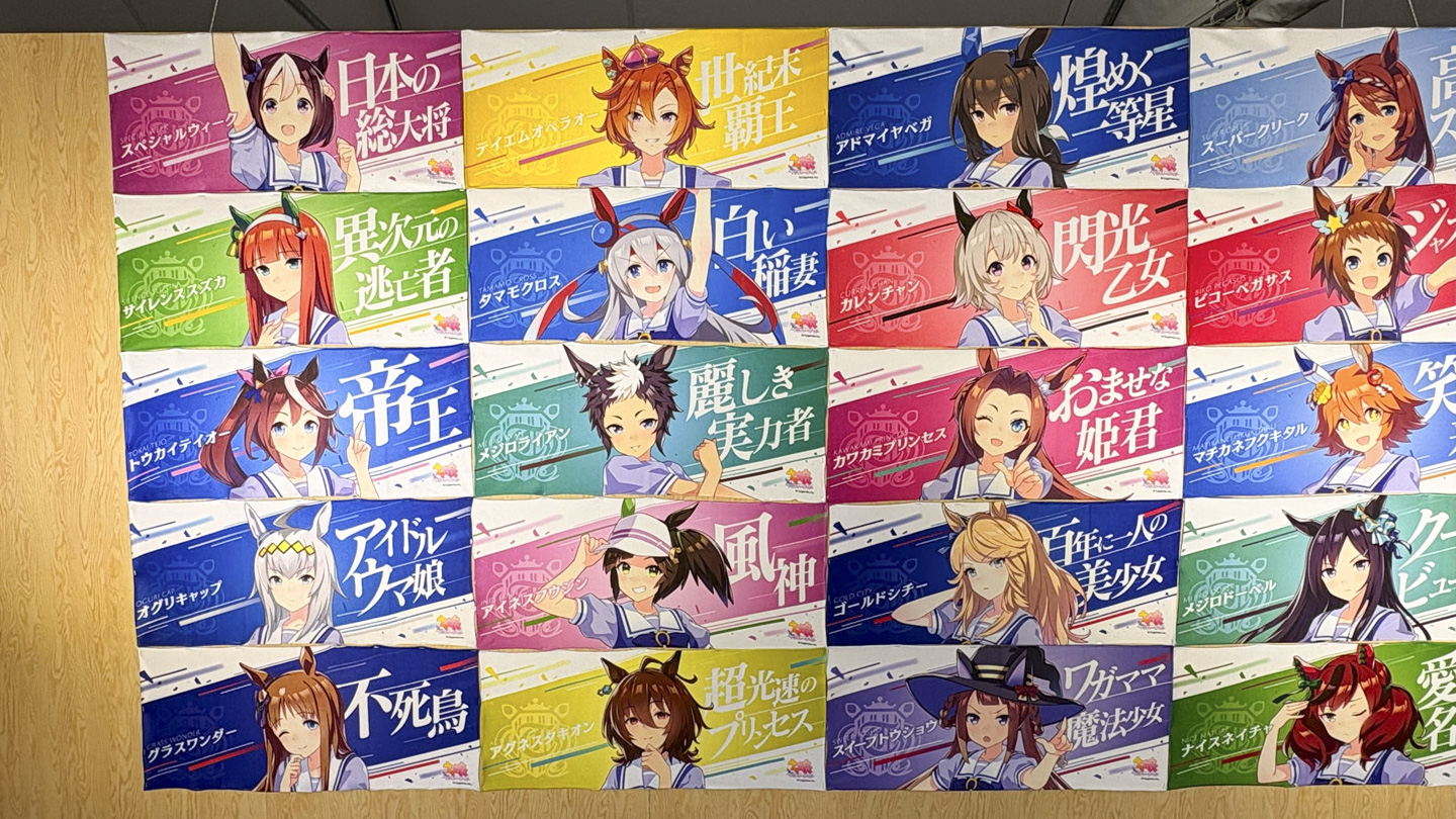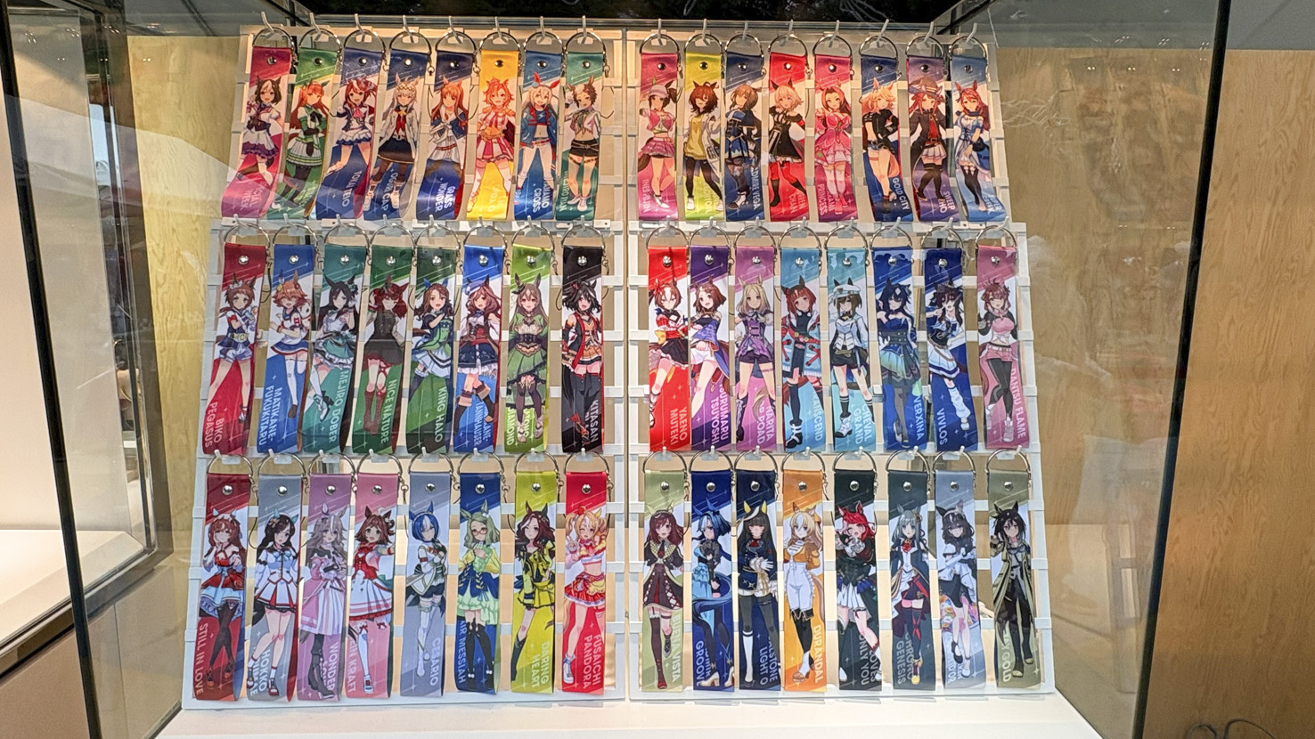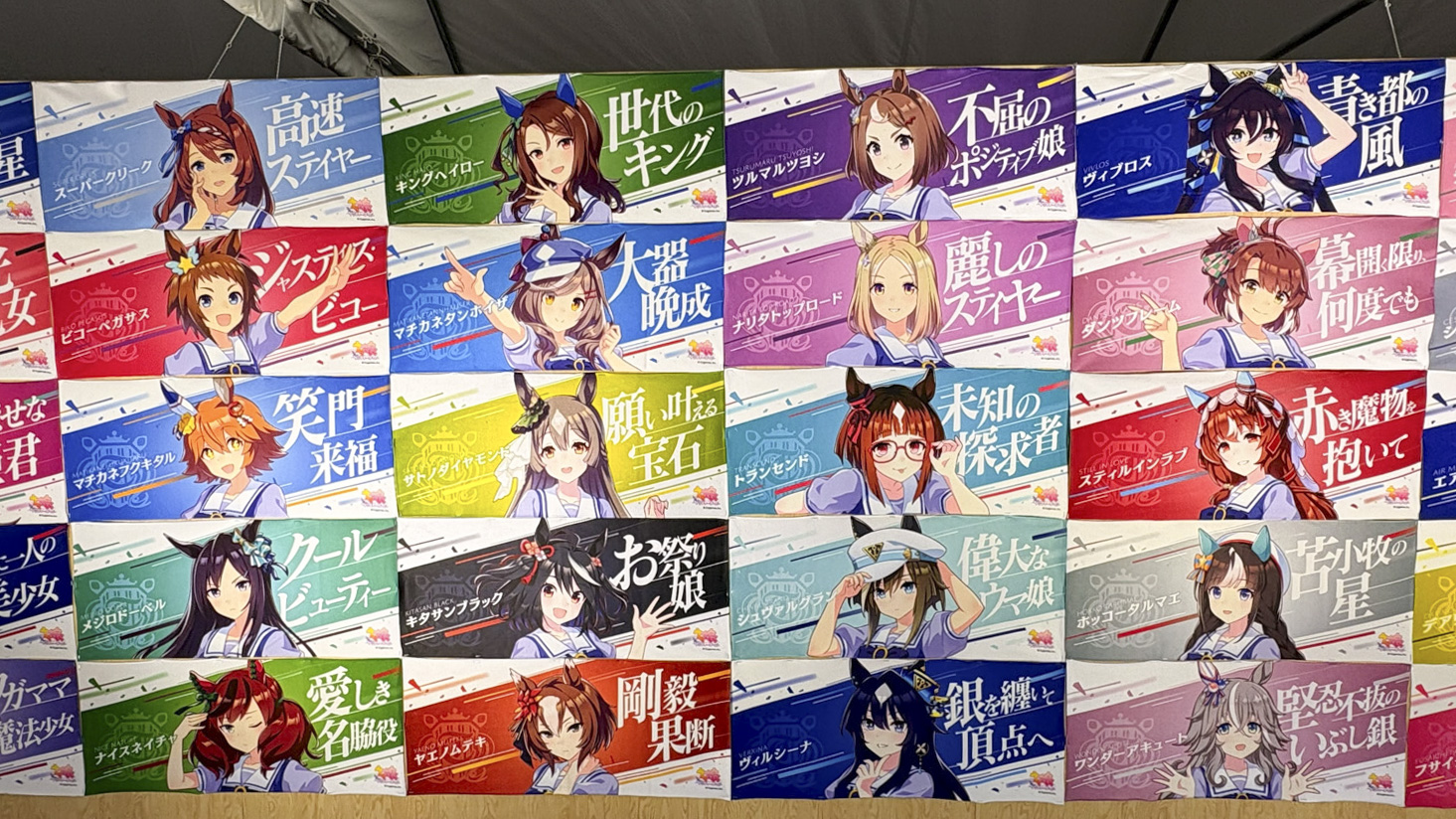 けやきひろばでは、今回販売されているグッズの実物展示も実施。パンフレットやアクリルスタンド、Tシャツやパーカーなどのオリジナルグッズを間近で見ることができた。なかでも壁に全種類並べて飾られた「公式応援タオル」や、キービジュアルの2人の「公式BIGタペストリー」は圧巻の迫力で非常に見応えがあり、雨の中でも豪華な展示を見ようと大勢のトレーナーたちの姿で賑わっていた。