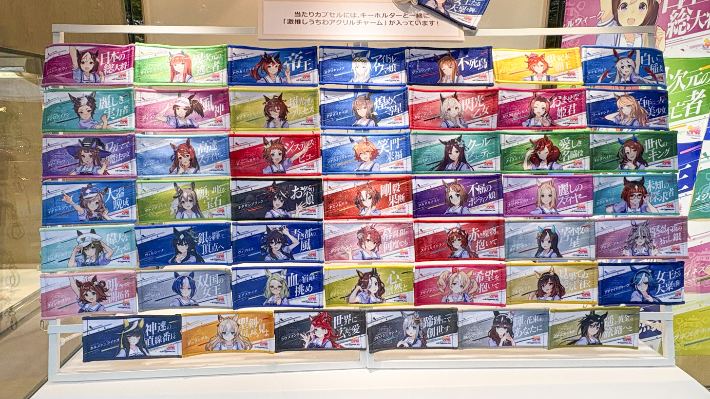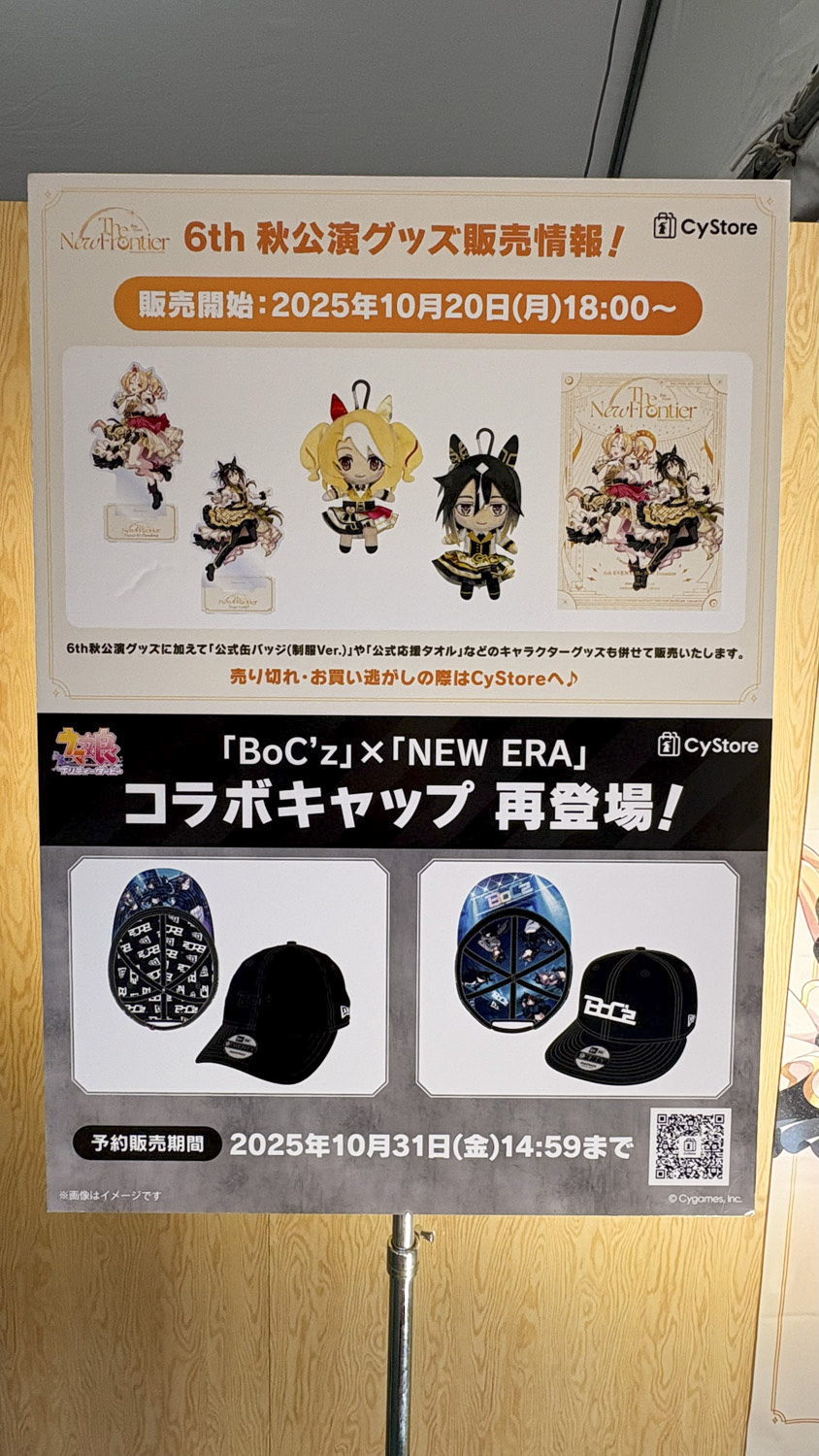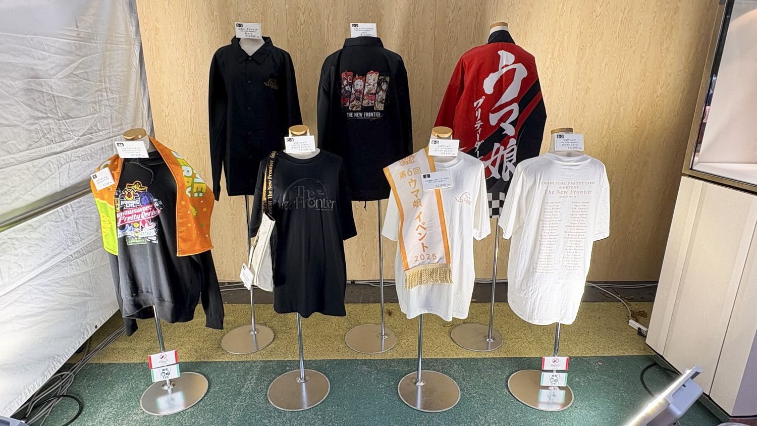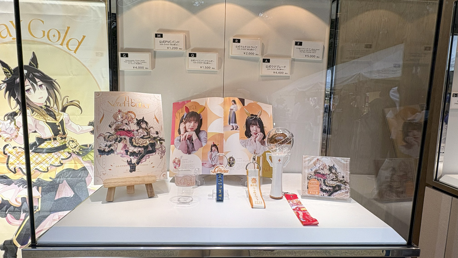 けやきひろばでは、今回販売されているグッズの実物展示も実施。パンフレットやアクリルスタンド、Tシャツやパーカーなどのオリジナルグッズを間近で見ることができた。なかでも壁に全種類並べて飾られた「公式応援タオル」や、キービジュアルの2人の「公式BIGタペストリー」は圧巻の迫力で非常に見応えがあり、雨の中でも豪華な展示を見ようと大勢のトレーナーたちの姿で賑わっていた。