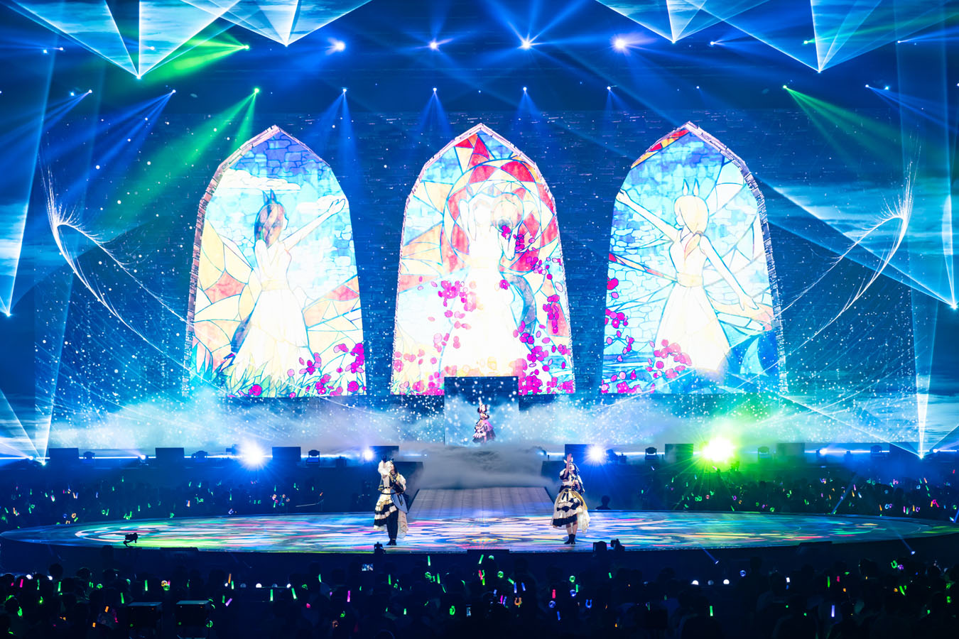 続いて、静かに始まった「Close my eyes」は、初披露となるヴィルシーナ、シュヴァルグラン、ヴィブロスたち3姉妹のユニット曲だ。夏吉さん、奥野さん、伊藤さんがセンターステージでおしゃれでメロウな楽曲をしっとりと歌い上げ、3姉妹の美しいハーモニーが会場を包み込む。