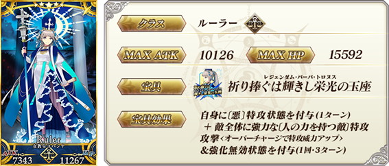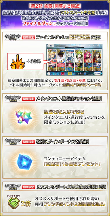 「第 2 部 終章」開幕に向けて、期間限定で第1部~奏章IVまでのメインクエストにおいて、バトル開始時に味方サーヴァント全員の NP を50%チャージする。