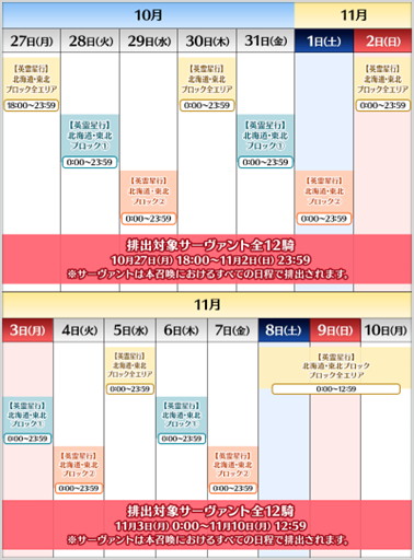 「Fate/Grand Order」10 周年を記念して実施している記念企画「OVER THE SAME SKY」。その描き下ろしイラストのうち、「北海道・東北」ブロック 14 種類の特別概念礼装「英霊星行」をピックアップする期間限定『【日替り】「OVER THE SAME SKY-OCTOBER-」ピックアップ召喚』(本召喚)を開催する。また本召喚は日替り開催となり、特別概念礼装のピックアップ対象は日ごとに切り替わる。さらに本召喚では、各概念礼装に描かれている★3 以上のサーヴァント12騎のみが排出対象となる。