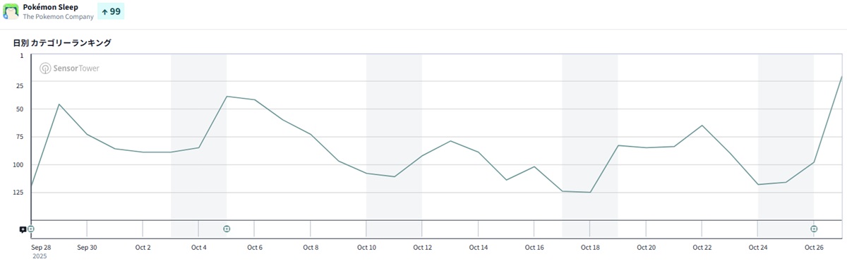 ポケモンの『Pokémon Sleep(ポケモンスリープ)』が61位から11位に順位を上げている。