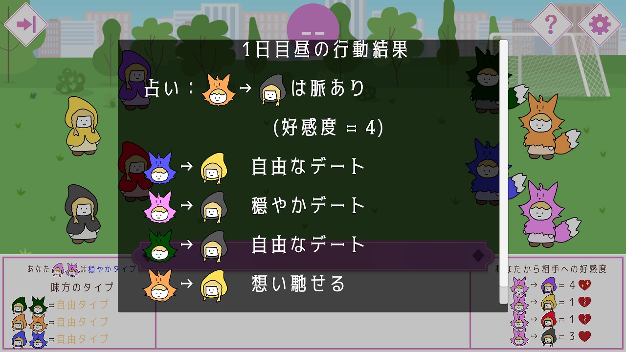 告白を成功させたい人狼は、相手の好感度を上げる行動をとったり、相手の好みを探ったり、誰が誰を狙っているかを読み合いながら、告白のタイミングを見極める。