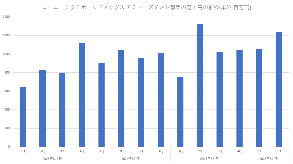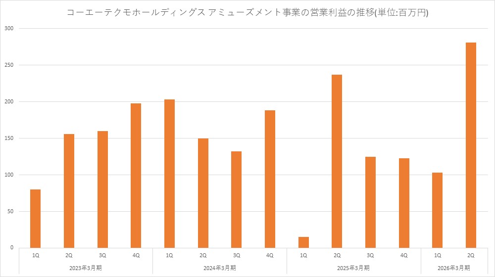 コーエーテクモホールディングス<3635>は、第2四半期会計期間(26年7~9月)におけるアミューズメント事業の業績について、売上高が前年同期比6.5%減の12億4000万円、営業利益が同18.6%増の2億8100万円だったことを明らかにした。2023年3月期以降では営業利益は最高水準となった。