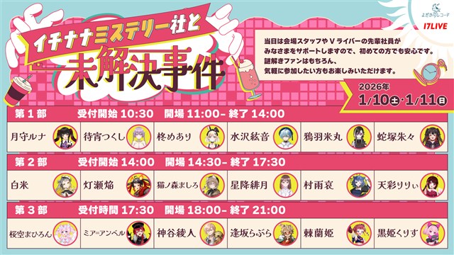 謎解きコラボVカフェ「ようこそ、イチナナミステリー社へin SHIBUYA」は、「17LIVE」で活躍するイチナナVライバーと一緒に「ドラマチック謎解き体験」ができるコラボカフェ。2025年7月に開催したアプリ内予選イベントにて、ランキング上位に入賞した18名のVライバーが登場する。チケットは全て食事(会場限定コラボフード、ドリンク、デザート付き)と謎解き体験がセットになっており、食事の際は各時間帯に出演するVライバーたちが順番にテーブルに挨拶に伺う。謎解きイベントは1人でも参加可能となっており、同じテーブルの方と協力して謎を解くことも、一人で謎を解くこともできる。また、イベント当日はコラボVカフェ会場限定グッズとして、Vライバーの名前が刻まれた「ランダムアクリルネームキーホルダー」を数量限定で販売する予定。