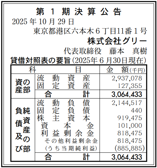 グリーホールディングス<3632>傘下のグリーの2025年6月期(第1期)の決算は、最終利益が8億8500万円だった。10月29日付の「官報」に掲載された「決算公告」で判明した。