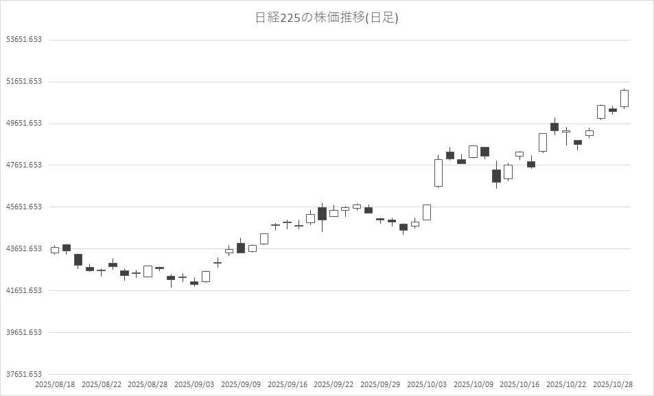 10月29日前場の東京株式市場は大幅反発。日経平均株価は、前営業日比1030円64銭高の5万1249円82銭で午前中の取引を終えた。取引時間中の史上最高値を更新し、初めて5万1000円台に乗せた。前日決算発表した半導体検査装置大手のアドバンテストが大幅上昇し、1銘柄で1000円ほど押し上げたという。日経平均構成銘柄のうち、値上がりが65、値下がりが165だったとのこと。