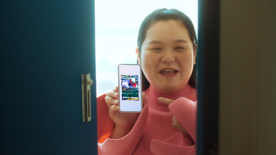 自宅のリビングで『ポケポケ』を楽しむ町田さん。スマホでポケモンカードのコレクションを眺めながら「あとはダークライだな」と呟くと、ちょうど家のチャイムがなります。玄関へ行きドアスコープを覗くと、そこにはお隣に住む田辺さんがお茶目に手を振っています。ドアを開けると、「ダークライがいっぱい集まっちゃって、もらってくれないかしら?」とスマホの画面を見せる田辺さん。ちょうど欲しかった町田さんは喜びの声を上げます。