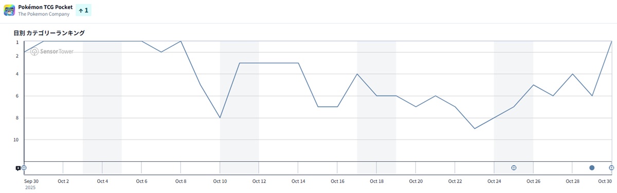 『ポケポケ』は10月30日より、1周年アップデートで新機能「おすそわけ」機能を実装。また、新しい拡張パック「メガライジング メガギャラドス」「メガライジング メガバシャーモ」「メガライジング メガチルタリス」が登場しており、ゲーム内の活性化が首位浮上の原動力となったようだ。