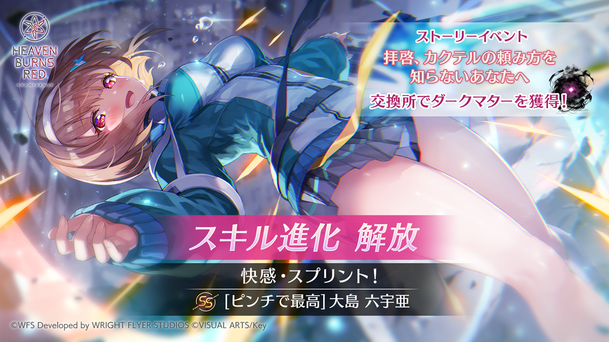SS[ピンチで最高] 大島六宇亜のスキル進化が解放!10月31日(金)11:00より、ストーリーイベント「拝啓、カクテルの頼み方を知らないあなたへ」イベント交換所にて、専用素材アイテム「ダークマター」が獲得できる。「ダークマター」を使用することで、SS[ピンチで最高] 大島六宇亜のEXスキル「快感・スプリント!」を進化させることができる。