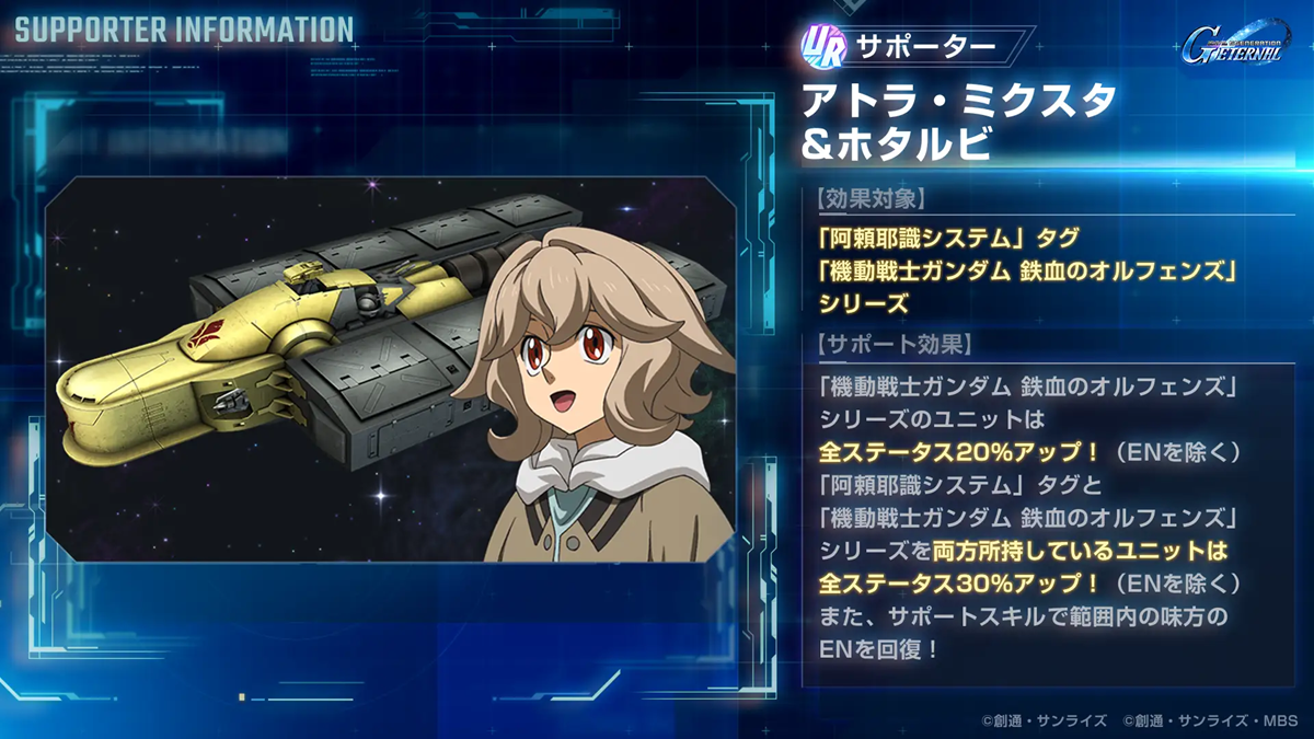 期間限定ユニットとして、UR「ガンダム・バルバトスルプスレクス(EX)」/UR「三日月・オーガス」が登場!また、UR「ガンダム・エアリアル改修型(EX)」/UR「スレッタ・マーキュリー」や、URサポーター「アトラ・ミクスタ&ホタルビ」が新登場sる。
