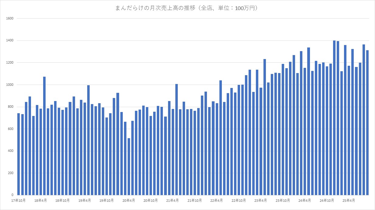 なお、2024年10月から2025年9月までの全店合計売上高は151億8200万円であり、前年同期比5.0%増だった。あくまで監査を受けていない速報値であることを留意する必要があるが、この累計売上高は、2026年9月期の売上高予想である150億0700万円を上回っている。