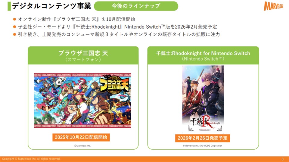 第3四半期以降の新作リリースの予定は、先日10月22日に『ブラウザ三国志』の完全新作スマートフォンアプリ『ブラウザ三国志 天』をリリースしたほか、子会社ジー・モードがオリジナルIP『千銃士:Rhodoknight』のNintendo Switch版を2026年2月に発売する予定となっている。