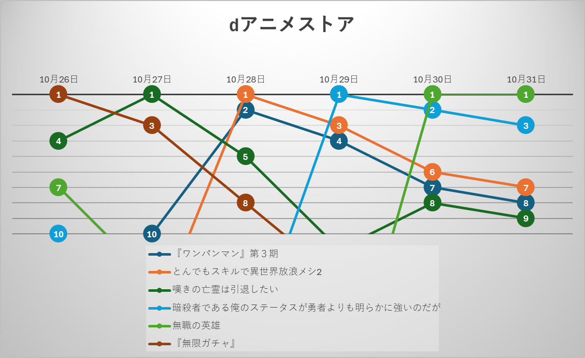 今週のdアニメストアランキング(10月26日~10月31日)では、『無職の英雄 ~別にスキルなんか要らなかったんだが~』が週の後半で首位を獲得。安定した人気を見せる『とんでもスキルで異世界放浪メシ2』や『ワンパンマン 第3期』を抑えてトップに立った点が注目。