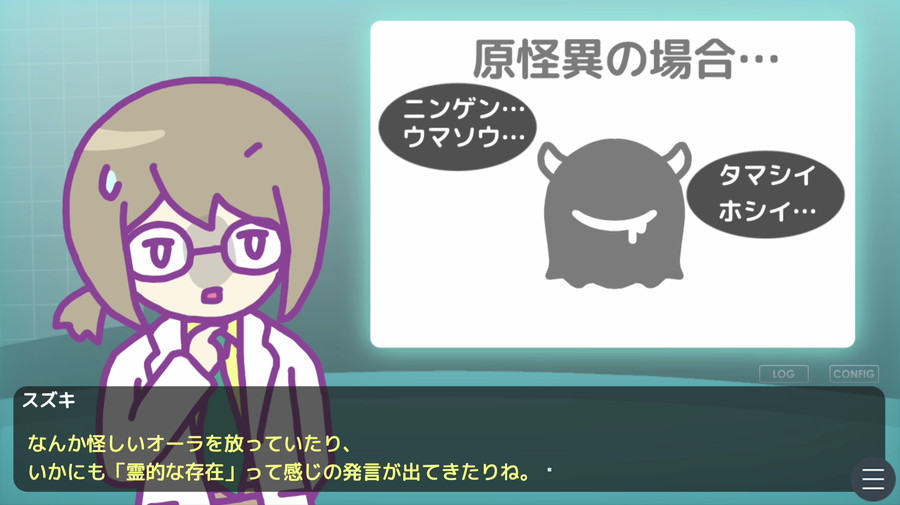 本作は、怪異が「元人間」か「ホンモノの怪異」かを二択で当てる怪異調査ノベルゲーム。怪異との対話を通じて、人間臭さや違和感を見つけ出すことがゲームの鍵となる。