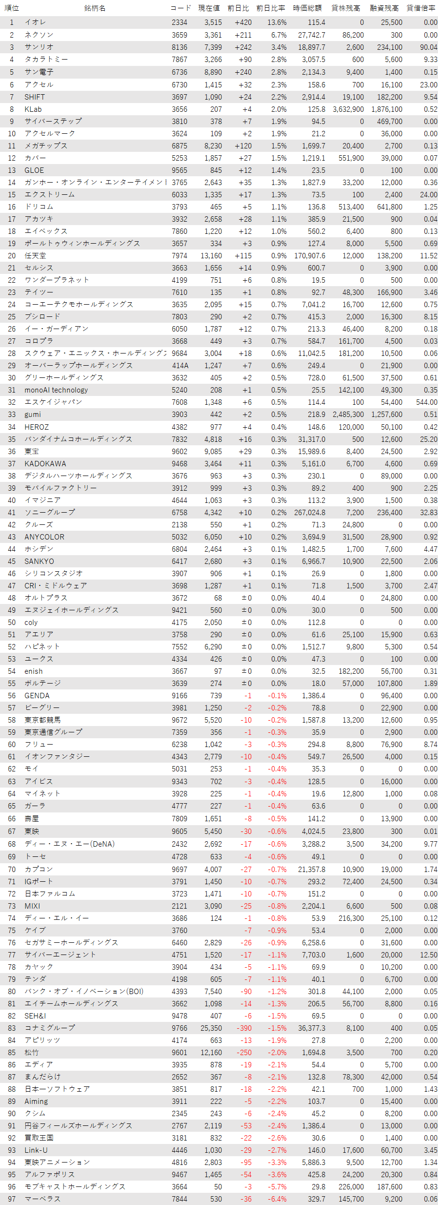 こうしたなか、ゲーム・エンタメ関連企業をみると、登録されている97銘柄のうち、上昇は47銘柄(48%)、下落は42銘柄(43%)、変わらずは8銘柄(8%)で、買い優勢だった。