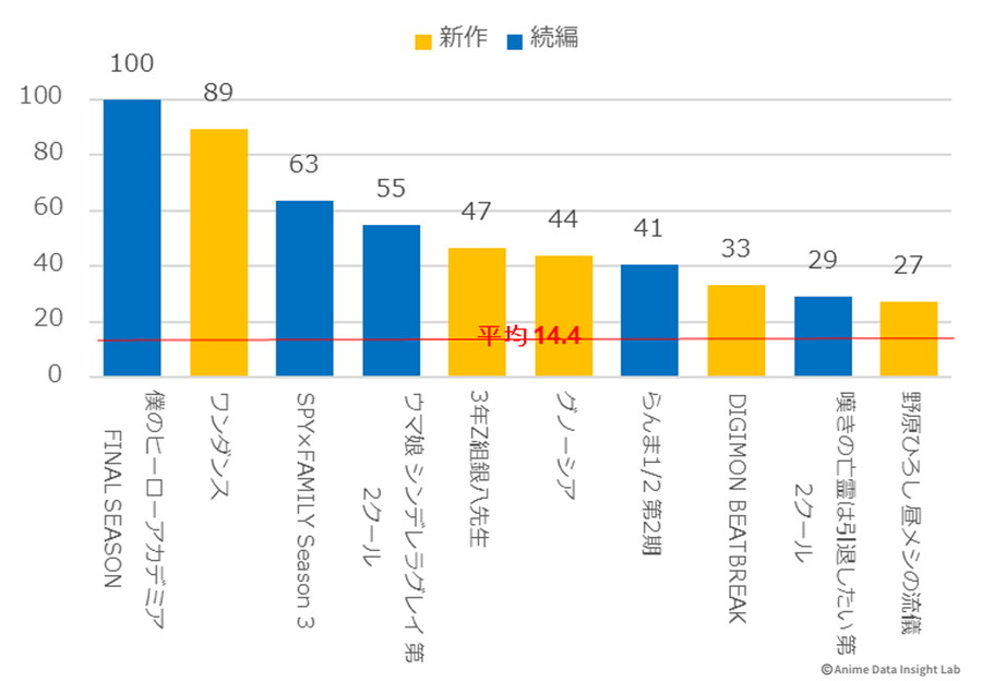 ファンスコアでは、『僕のヒーローアカデミア FINAL SEASON』がトップ。注目すべきは2位の『ワンダンス』で、トレンドスコアは9位だがファンスコアは2位とファンスコア優位となっている。