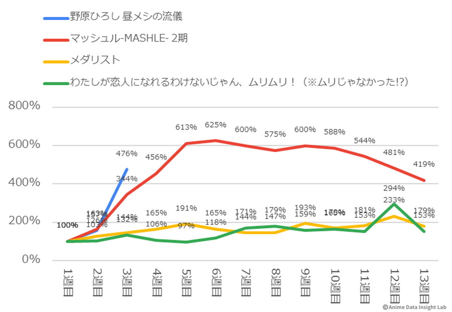 今季最大のサプライズは『野原ひろし 昼メシの流儀』の450%という過去最高の伸びだ。初週は控えめなスタートだったが、3週目には急上昇し、初週比4.5倍という数値を記録した。SNSでの口コミ効果が徐々に広がり、「クレヨンしんちゃん」の人気キャラクターを主人公にしたスピンオフ作品への注目が加速度的に高まっていることがわかる。