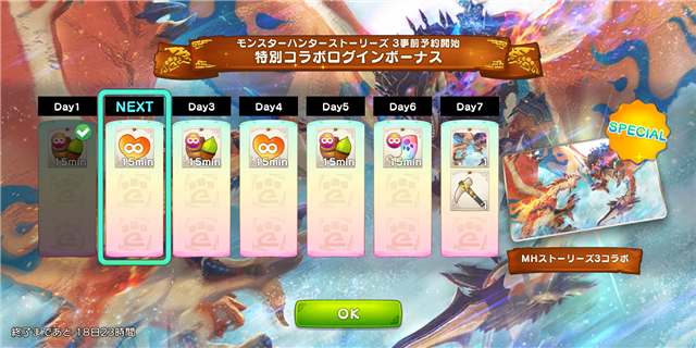 本日11月4日11:00より、『モンスターハンターストーリーズ3 ~運命の双竜~』の予約開始を記念したコラボログインボーナスを配布!『モンスターハンターストーリーズ3 ~運命の双竜~』をテーマにした壁紙が獲得できる。