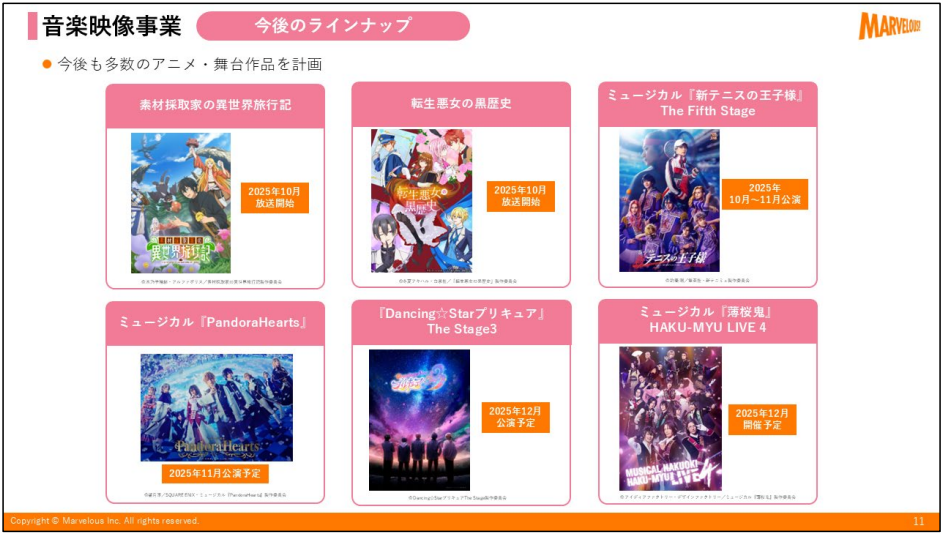 今後のラインナップとしては、テレビアニメでは『素材採取家の異世界旅行記』と『転生悪女の黒歴史』を 10 月より放送開始した。