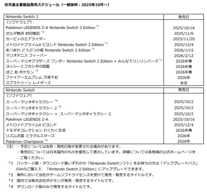 今後、Nintendo Switch 2専用タイトルとして発売が予定されているのは、11月6日の『ゼルダ無双 封印戦記』(国内販売はコーエーテクモゲームス)、11月20日の『カービィのエアライダー』、2026年2月12日の『マリオテニス フィーバー』のほか、2026年春の『ヨッシーとフカシギの図鑑』と『ぽこ あ ポケモン』(国内販売はポケモン)、2026年の『ファイアーエムブレム 万紫千紅』、発売日未定の『スプラトゥーン レイダース』となっている。