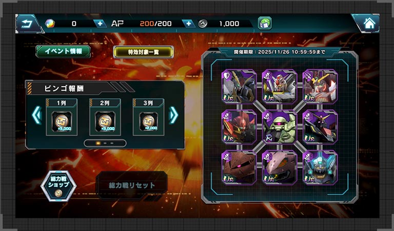 「総力戦」は縦3マス×横3マスの合計9マスにいる敵部隊を撃破していくイベントで、撃破したマスでラインがそろうたびに豪華報酬を獲得することができる。
