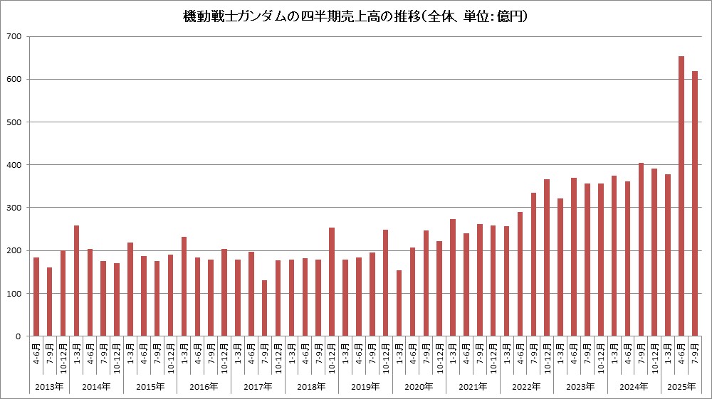 同社では、ガンダムシリーズ新作「機動戦士Gundam GQuuuuuuX」人気がグループ全体に波及した、としている。「機動戦士Gundam GQuuuuuuX」の興行収入だけでなく、ライセンス収入が好調だった。「ガンダムカードゲーム」が順調な立ち上がりをみせ、ガンプラ45周年と関西万博による話題喚起も奏功したという。ゲームでは『SDガンダム ジージェネレーション エターナル』が貢献した。