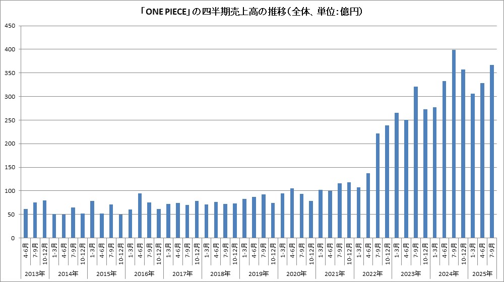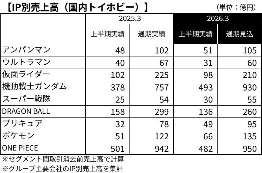 その他のIP別売上をみると、ドラゴンボールが同14.9%減の651億円、ワンピースが同5.0%減の695億円、仮面ライダーが同8.2%減の134億円、NARUTOが同12.6%減の131億円など、マイナスとなった作品が目立った。他方、スーパー戦隊は同17.2%増の34億円と伸びたものの、売上規模は仮面ライダーの3分の1にとどまった。プリキュアは同51.5%増の50億円だった。