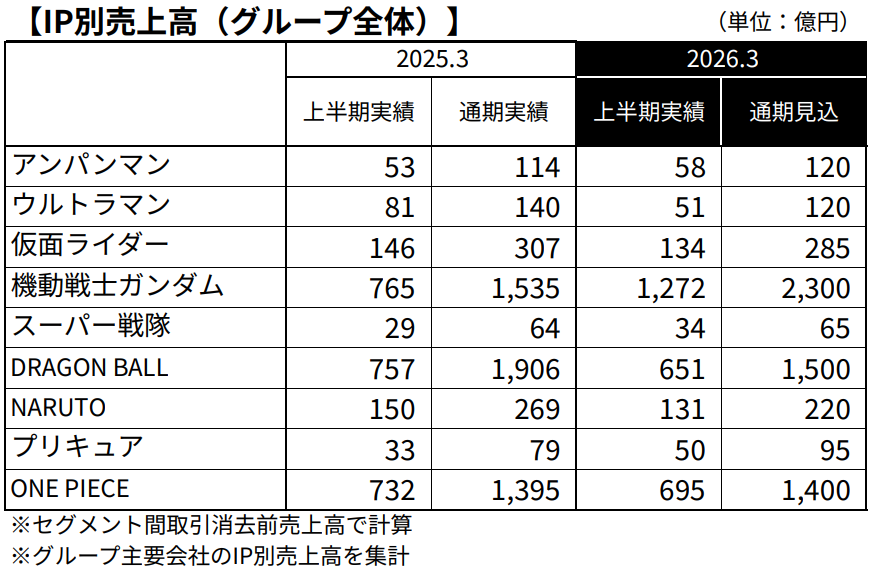 バンダイナムコホールディングス<7832>は、この日(11月8日)開示した9月中間決算で、IP別売上で「機動戦士ガンダム」の売上高が急増したことを明らかにした。グループ全体では、前年同期比66.3%増の1272億円と大きく伸びた。グラフにするとわかるが、2026年3月期に入ってステージが変わったと感じるレベルの変化である。前年同期はドラゴンボールとほぼ同規模だったが、今期は68%上回りグループをけん引するIPとなっている。