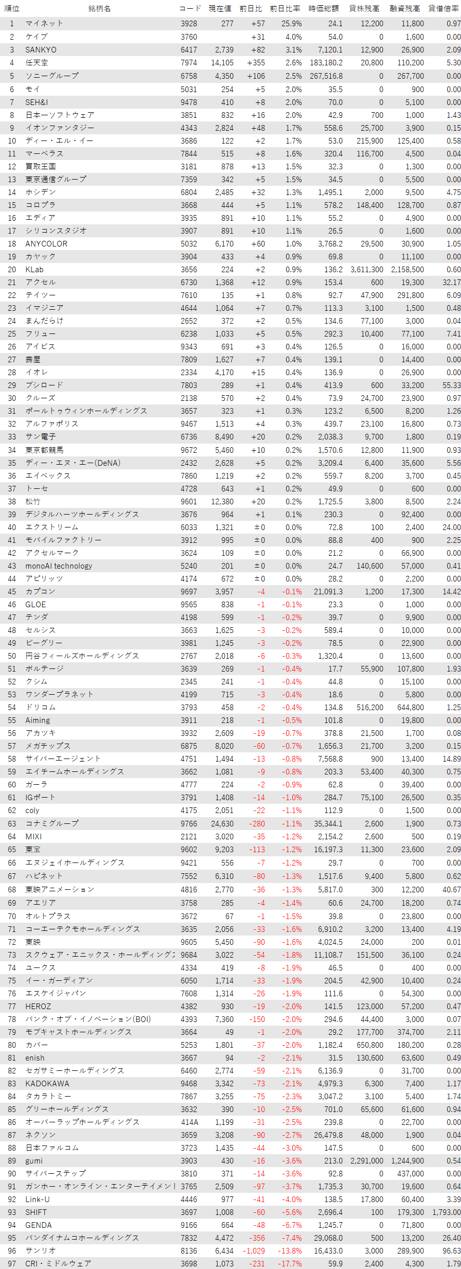 モバイルゲーム系の銘柄は、DeNA<2432>、コロプラ<3668>、ケイブ<3760>が高く、モバイルファクトリー<3912>が変わらず、サイバーエージェント<4751>、MIXI<2121>、グリーHD<3632>、ガンホー<3765>、アカツキ<3932>が安い。