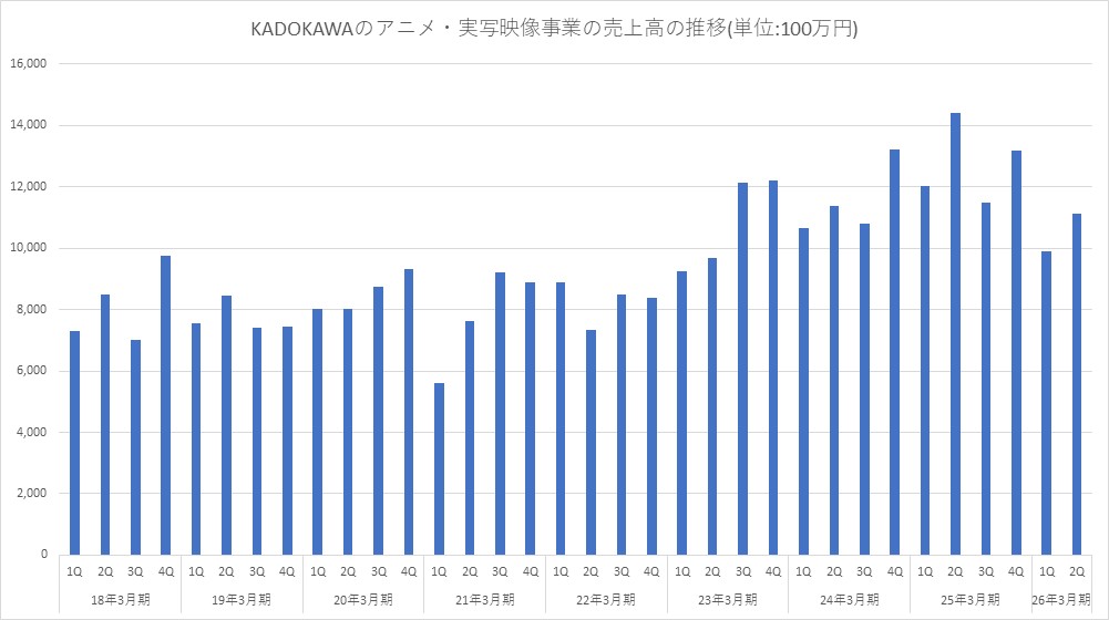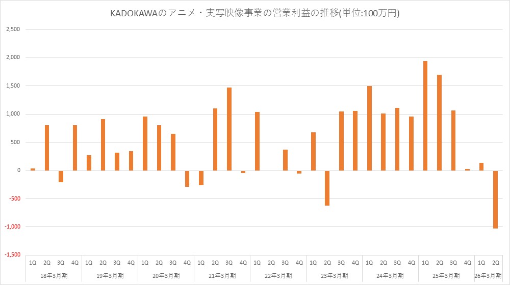 KADOKAWA<9468>は、アニメ・実写映像セグメントの9月中間決算について、売上高が前年同期比20.4%減の210億3000万円、営業損失は8億9500万円(前年同期は36億4000万円の利益計上)と減収・赤字転落となった。