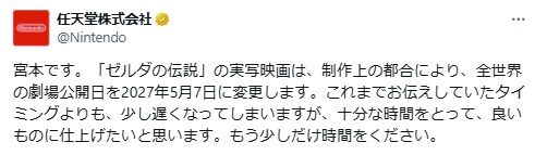 なお、実写映画『ゼルダの伝説』は、2027年3月26日公開予定だったが、公開日を2027年5月7日へと延期することが発表されている。
