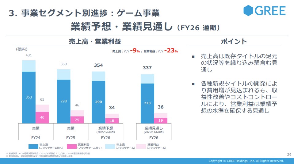 ゲーム事業の2026年6月期通期の見通しについては、既存タイトルの足元の状況などを織り込み、当初予想より弱含む見通しとしている。