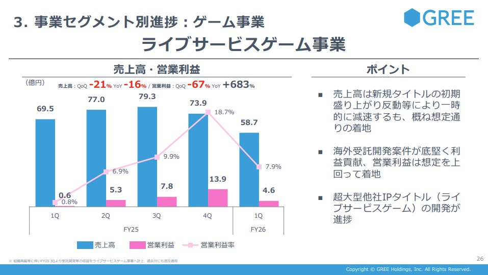 ライブサービスゲーム事業は、新作『魔法少女まどか☆マギカ Magia Exedra』(以下『まどドラ』)の初動の盛り上がりからの反動などにより一時的に減速した。ただし、海外受託開発案件が底堅く推移したことで利益は前年同期を上回った。