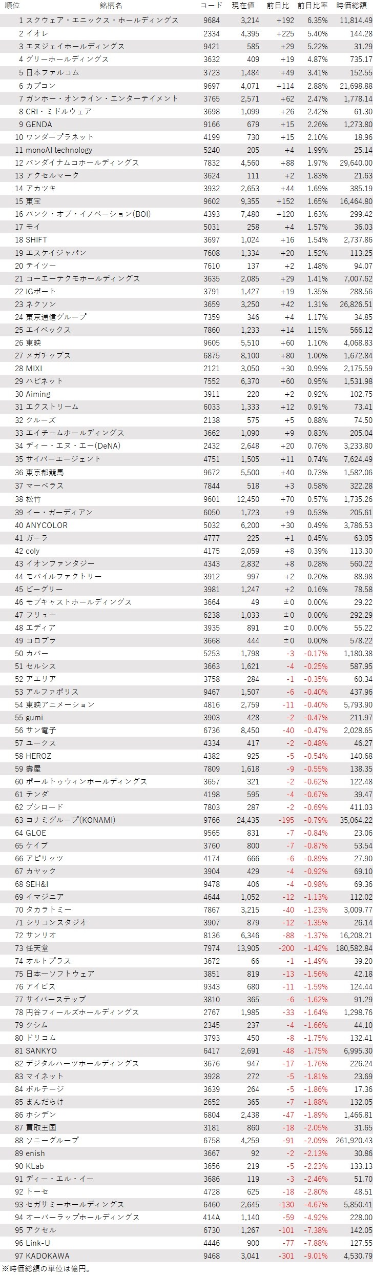 そうした中でゲーム・エンタメ関連株の動きを見てみると、下記の表に登録しているゲーム・エンタメ関連企業97銘柄のうち、上昇は45銘柄(46%)、下落は48銘柄(49%)、変わらずは4銘柄(4%)で、下落した銘柄の方がやや多かった。