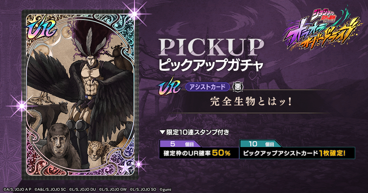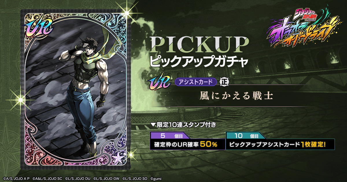 gumi<3903>は、「ジョジョの奇妙な冒険」のアニメーションIPを活用した新作アプリゲーム『ジョジョの奇妙な冒険 オラオラオーバードライブ』において、11/7(金) 15時頃より下記ラインナップのガチャを開催している。