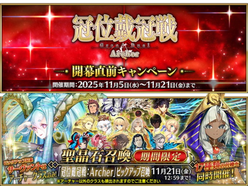 『FGO』はアーチャークラスの「冠位戴冠戦」を 2025 年 11 月 14 日より開催する。新たな戦いに備えるために、アーチャークラスのサーヴァント強化をサポートするキャンペーン『「冠位戴冠戦:Archer」開幕直前キャンペーン』(本キャンペーン)を2025年11月5日18:00から開催。